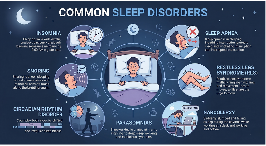 - Circadian Rhythm Disorders – Problems with the body’s internal clock that affect the sleep–wake cycle.
