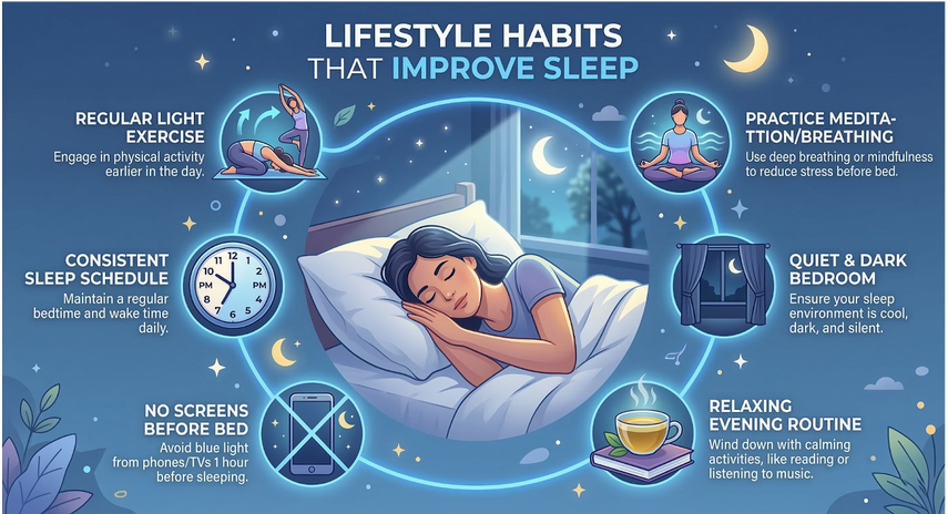 Healthy lifestyle practices have been found to play an important role in improving sleep quality. Physical activities help relax the body to improve sleep quality. Maintaining a daily routine of going to bed and waking up at the same time every day is also important. It helps to regulate the internal clock of the body. Stress is relieved through various relaxation practices such as meditation, deep breathing exercises, or stretching. It has also been found that avoiding caffeinated products or reducing screen time before going to bed helps to prepare the body to sleep. If good sleep is to be obtained, it is essential to adopt good lifestyle practices.